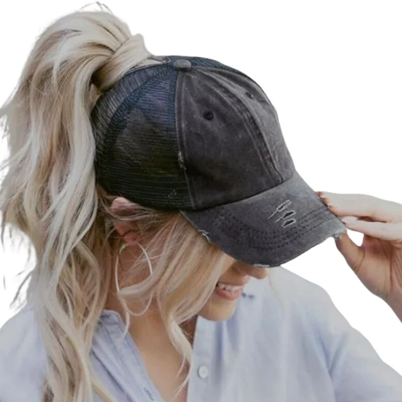 La Casquette avec Trou Pour Femme, une casquette au style audacieux avec un design unique et un filet respirant, alliant confort et style vintage pour un look dynamique et moderne.