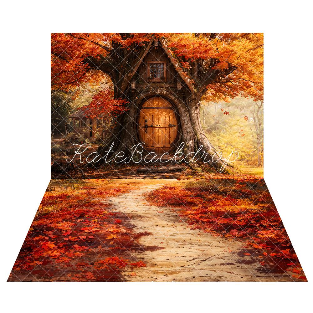 Kate Automne Feuilles d’érable Cabane Forêt Toile de fond+Automne Rouge Feuilles Chemin Sol Toile de fond