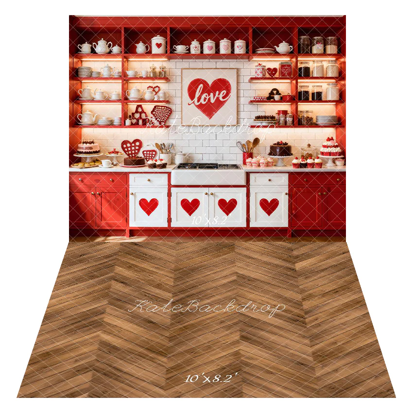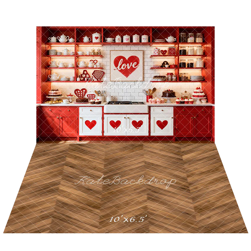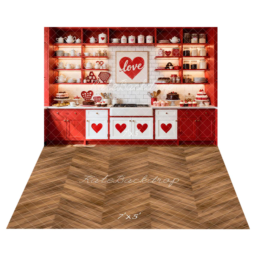 Kate Saint Valentin Cuisine Rouge Cœurs Toile de fond+Bois Chevron Marron Sol Toile de fond